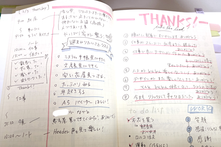 この時のフォーマットは、左ページの端に今日あったことを時系列で書いて、右に感じたことを書く。右ページには感謝ログを毎日書く、というものです。