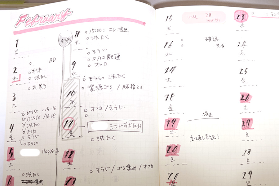 初月なんでどこにどれぐらい書いたらいいか分からず、手あたり次第思いついた用事を書いたりしました。しかし、字が雑過ぎて見づらい…雑に書きなぐっていたことは反省しています(^^;)